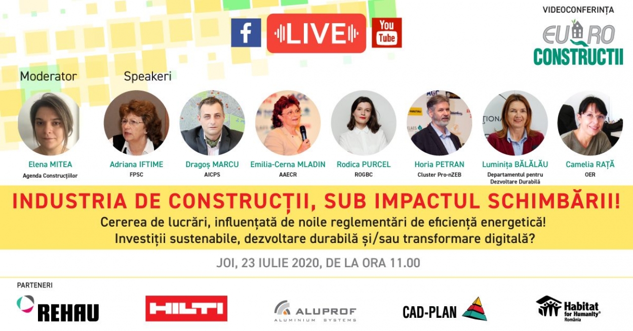 Noua ediție a videoconferinței EURO-Construcții, cu focus pe Construcții Sustenabile și Eficiență Energetică, are loc joi, 23 iulie 2020 de la ora 11.00 și reunește specialiști importanți în
